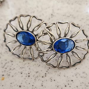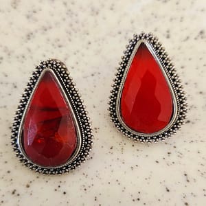 These earrings are a fusion of Indo-Boho style, crafted with a mix of German silver and brass, adorned with vibrant red, pink, blue and turquoise Monalisa stones. The intricate design and bold colours make them a statement piece for any bohemian-inspired outfit.