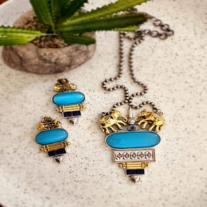 This Indo Boho style necklace set exudes an eclectic charm, crafted from a blend of German silver and brass. Adorned with a captivating combination of Monalisa orange stone and an array of vibrant multicoloured stones, it’s a testament to artisanal finesse. The piece features an intricate animal motif complemented by delicate German silver beaded threading, adding a touch of whimsy. Additionally, the set boasts exquisite pachi kundan work, elevating its allure with traditional elegance.