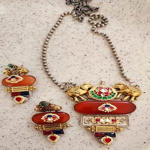 This necklace set blends the charm of Indo Boho style with intricate craftsmanship. Crafted from German silver and brass, it features a captivating bird motif adorned with beads, creating a fusion of elegance and cultural flair. The German silver beaded thread adds a touch of sophistication, making it a unique statement piece for any occasion.