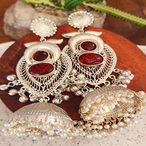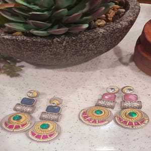 Indo Boho earrings feature a fusion of cultural influences, crafted from German silver and adorned with striking red Monalisa stones. Their charm lies in their intricate yet understated design, showcasing delicate patterns and small, simple elements that evoke a sense of bohemian elegance. Perfect for adding a touch of exotic flair to any ensemble.