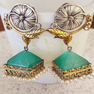 Make a statement with these exquisite earrings featuring intricate animal motifs crafted from German silver and adorned with golden plating. The design is elevated with stunning blue and black Monalisa stones, blending Indo-Boho flair with masterful craftsmanship.